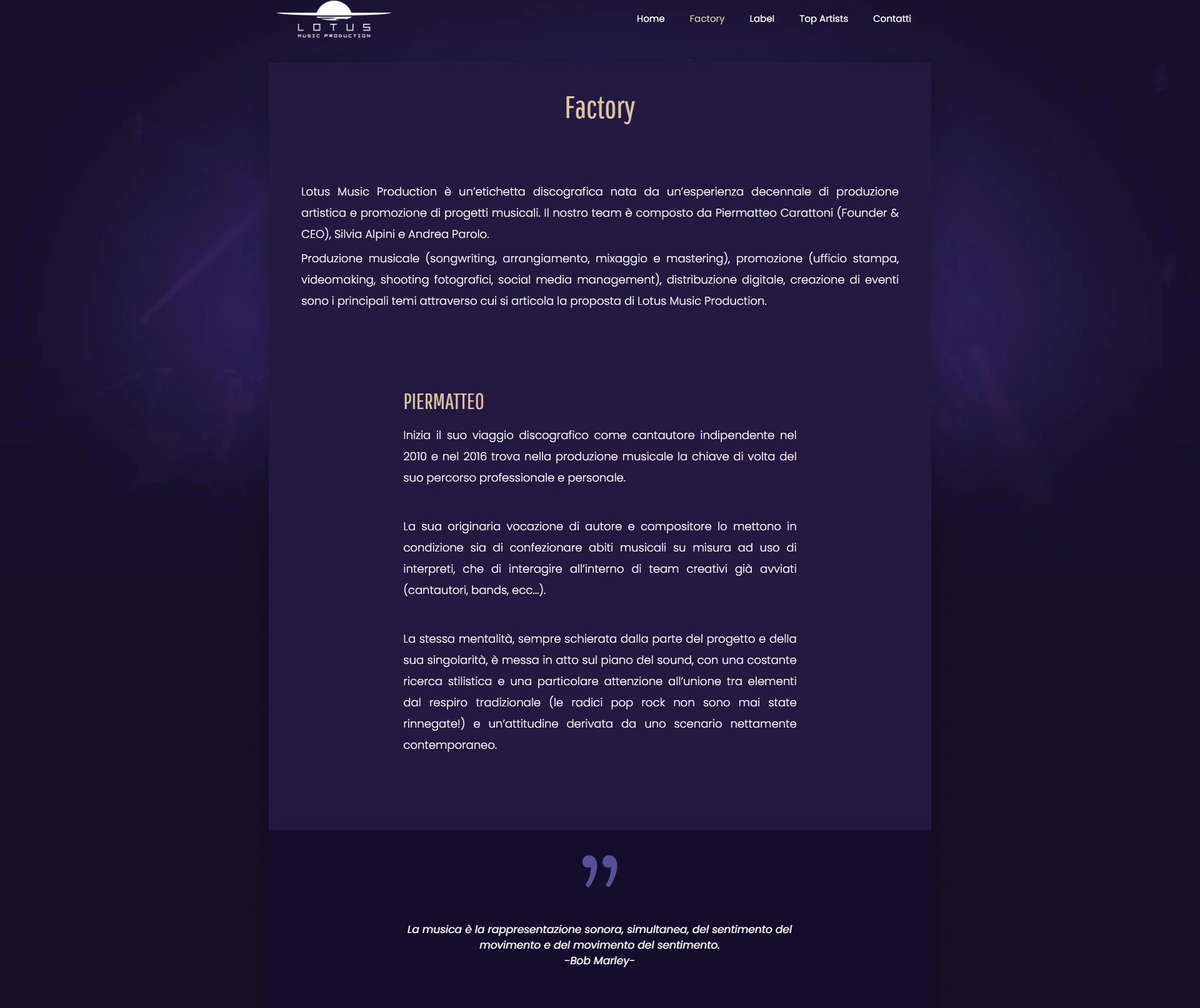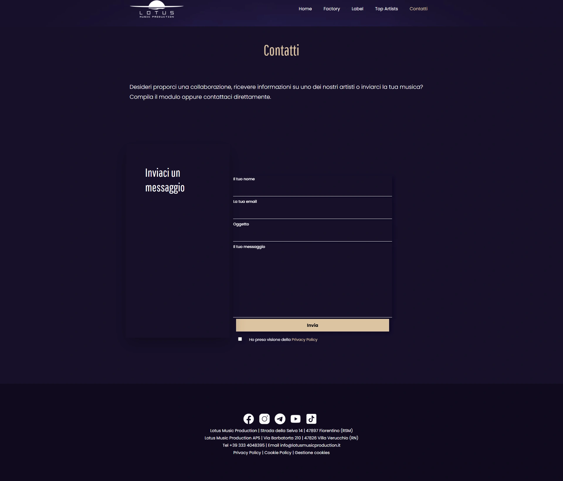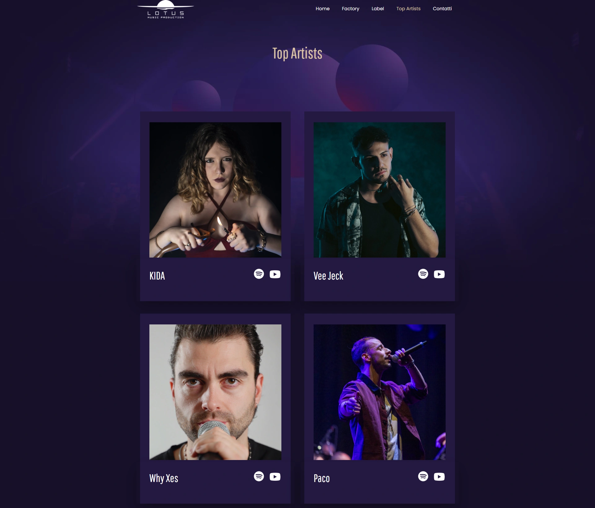 Grazie a un design responsive, ottimizzato per tutti i dispositivi, il sito diventa un vero e proprio biglietto da visita digitale: uno spazio dinamico che racconta la visione di Lotus Music Production e ne amplifica la presenza online.